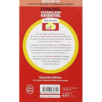 Espagnol Vocabulaire essentiel, 3 000 phrases, par France Chabod et Helene Hernandez, me parait un ouvrage detaille (42 chapitres thematiques) et moderne (neologismes )et embrassant l eventail des pays hispanophones( americanismes).Cependant, les 9 000 mots me paraissent une liste tiree de dictionnaires bilingues ( exemple, dans le 2eme centre d nteret portant sur le corps, on donne : el cuerpo > le corps ou encore la fuerza > la force).Ce que j ai trouve valable , c est la section portant sur les phrases et locutions qui vraiment apporte du pratique comme par exemple toujours dans ce 2eme centre d interet ( Tiene 1,80 metro de estatura > il mesure 1,80 metre).Autre point positif : la bibliographie qui se divise en 3 sections : dictionnaires, guides et grammaires, revues espagnoles; cette bibliographie s etend sur 2 pages et peut servir a celui qui voudrait approfondir.Texte utile mais beaucoup de remplissage.